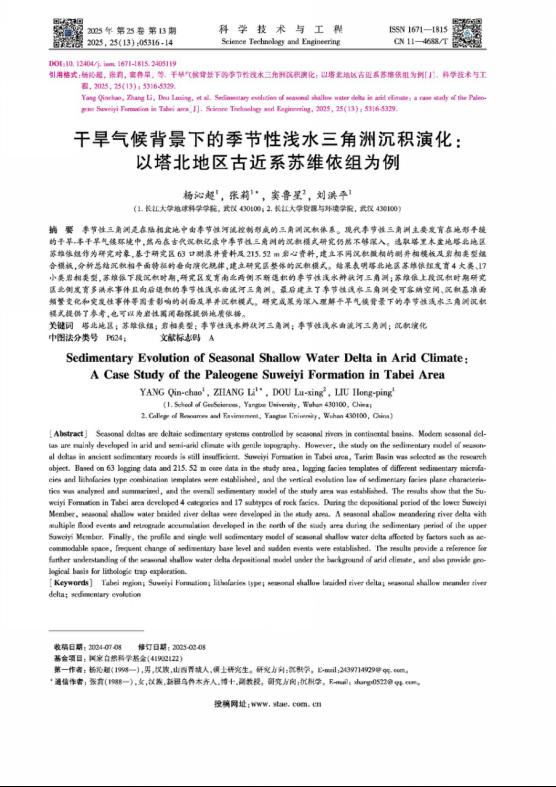 澳门十大网投正规官网平台硕士生杨沁超在中文核心期刊《科学技术与工程》上发表了题为“干旱气候背景下的季节性浅水三角洲沉积演化:以塔北地区古近系苏维依组为例”的研究论文。澳门十大网投正规官网平台为论文第一署名单位,硕士研究生杨沁超为论文第一作者,张莉副教授为通讯作者。