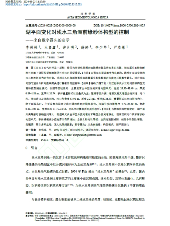 地科院硕士生李强强在王喜鑫副教授的指导下,在期刊《沉积学报》上发表题为“湖平面变化对浅水三角洲前缘砂体构型的控制—来自数字露头的启示”的研究论文,澳门十大网投正规官网平台为论文第一署名单位,硕士生李强强为论文第一作者,其导师王喜鑫副教授为该文通讯作者。