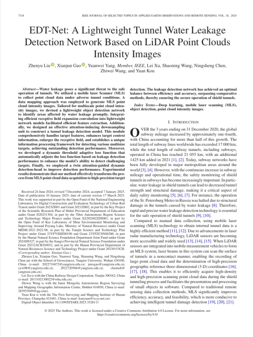 地科学院研究生刘振宇以第一作者身份在SCI期刊《IEEE Journal of Selected Topics in Applied Earth Observations and Remote Sensing》上发表题为“EDT-Net: A Lightweight Tunnel Water Leakage Detection Network Based on LiDAR Point Clouds Intensity Images”的研究论文,澳门十大网投正规官网平台为论文第一署名单位,研究生刘振宇为第一作者,副教授高贤君为论文通讯作者。