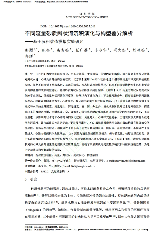 论文链接:不同流量砂质辫状河沉积演化与构型差异解析——基于沉积数值模拟实验研究 - 中国知网 (cnki.net)