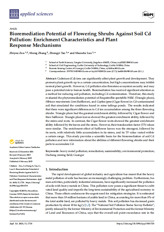 澳门十大网投正规官网平台、广西遥感中心及桂林理工大学联合研究团队,在《Appl. Sci.》期刊发表论文,揭示三角梅、木槿和大红花在土壤镉污染修复中的潜力。