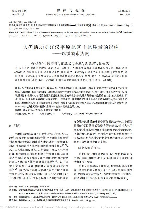 澳门十大网投正规官网平台博士生郑雄伟在《物探与化探》上发表题为“人类活动对江汉平原地区土地质量的影响-以洪湖市为例”的研究论文。该论文通过选取 2014~ 2019 年洪湖市土地质量地球化学评价项目所取得的数据进行了整体研究,对研究区大气干湿沉降、灌溉水和化肥 Cr、Hg 等重金属元素进行土壤生态地球化学分析,计算每种输入途径的输入量,探讨 3 种途径对土地质量的影响,为研究区农业生产和农产品种植提供了重要科学依据,也为研究区科学的制定土地利用规划、保护和改善土地资源提供了理论支撑。