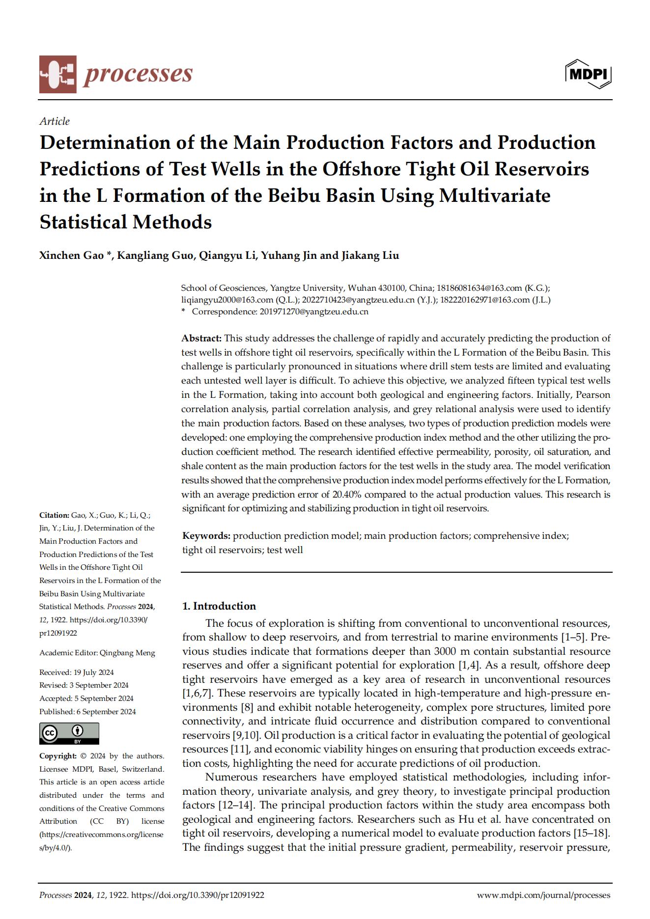 澳门十大网投正规官网平台22级博士研究生在期刊《Processes》上发表题为“Determination of the Main Production Factors and Production Predictions of Test Wells in the Offshore Tight Oil Reservoirsin the L Formation of the Beibu Basin Using Multivariate Statistical Methods”的研究论文。澳门十大网投正规官网平台为论文第一署名单位,高昕晨为第一通讯作者。