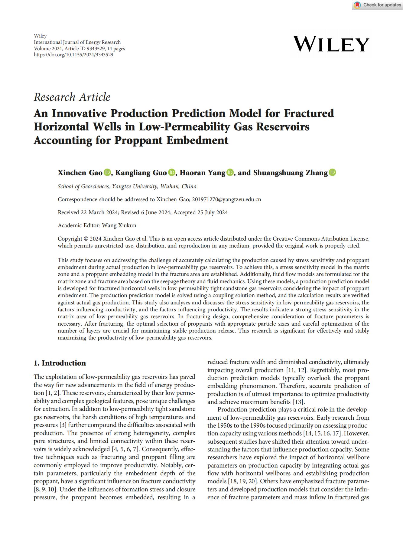 澳门十大网投正规官网平台22级博士研究生在期刊《International Journal of Energy Research》上发表题为“An Innovative Production Prediction Model for FracturedHorizontal Wells in Low-Permeability Gas ReservoirsAccounting for Proppant Embedment”的研究论文。澳门十大网投正规官网平台为论文第一署名单位,高昕晨为第一通讯作者。