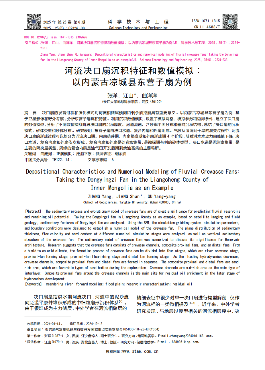 近日,澳门十大网投正规官网平台地质学专业2022级硕士生张洋在中文核心期刊《科学技术与工程》发表题为“河流决口扇沉积特征和数值模拟:以内蒙古凉城县东营子扇为例”的研究论文。澳门十大网投正规官网平台为论文第一署名单位,硕士生张洋为论文第一作者,其导师江山教授为通讯作者。