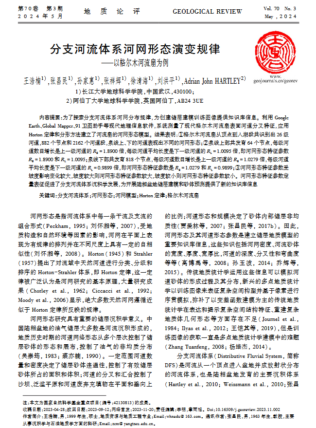 澳门十大网投正规官网平台硕士生王浩楠在中文核心期刊《地质论评》上发表题为“分支河流体系河网形态演变规律-以格尔木河流扇为例”的研究论文。澳门十大网投正规官网平台为论文第一署名单位,硕士生王浩楠为论文第一作者,其导师张昌民教授为通讯作者。