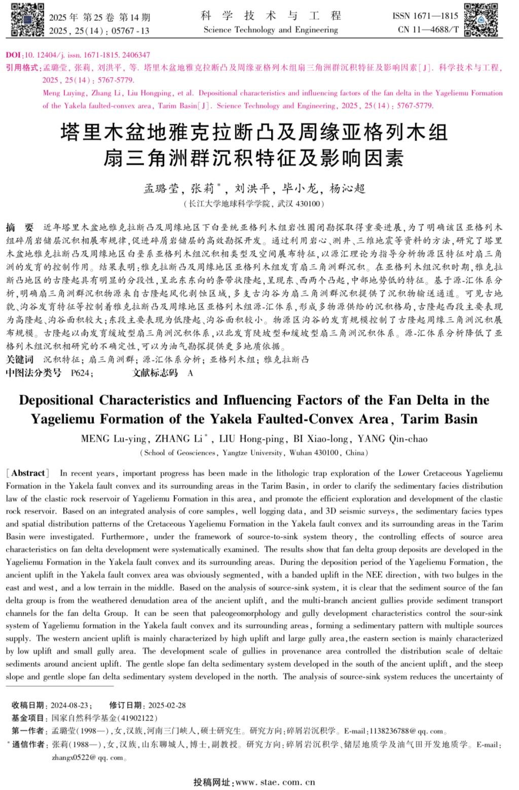 澳门十大网投正规官网平台22级硕士研究生孟璐莹在期刊《科学技术与工程》上发表题为“塔里木盆地雅克拉断凸及周缘亚格列木组扇三角洲群沉积特征及影响因素”的研究论文。澳门十大网投正规官网平台为论文第一署名单位,硕士研究生孟璐莹为论文第一作者,其导师张莉副教授为该文通讯作者。