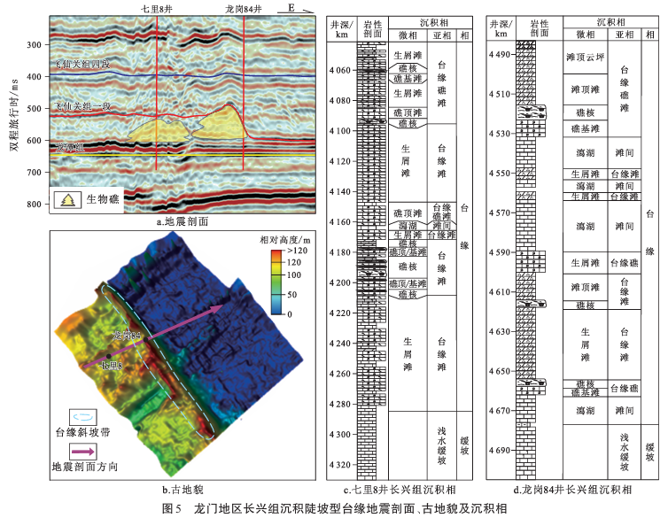 图2龙门地区长兴组沉积陡坡型台缘地震剖面、古地貌及沉积相