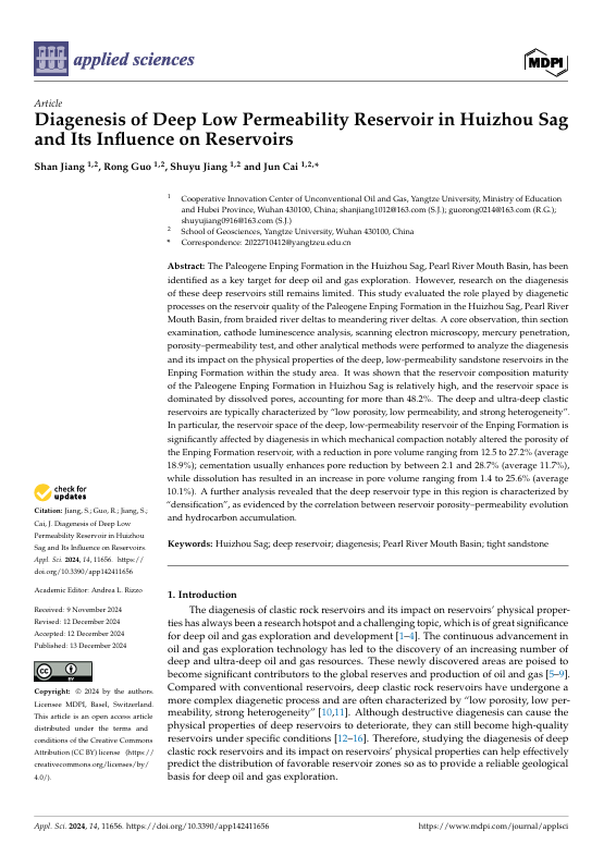 澳门十大网投正规官网平台地质学专业硕士生姜珊在SCI收录期刊《Applied Sciences》上发表题“Diagenesis of Deep Low Permeability Reservoir in Huizhou Sag and Its Influence on Reservoir”的研究论文。澳门十大网投正规官网平台为论文第一署名单位,硕士生姜珊为论文第一作者,其导师蔡俊副教授为通讯作者。