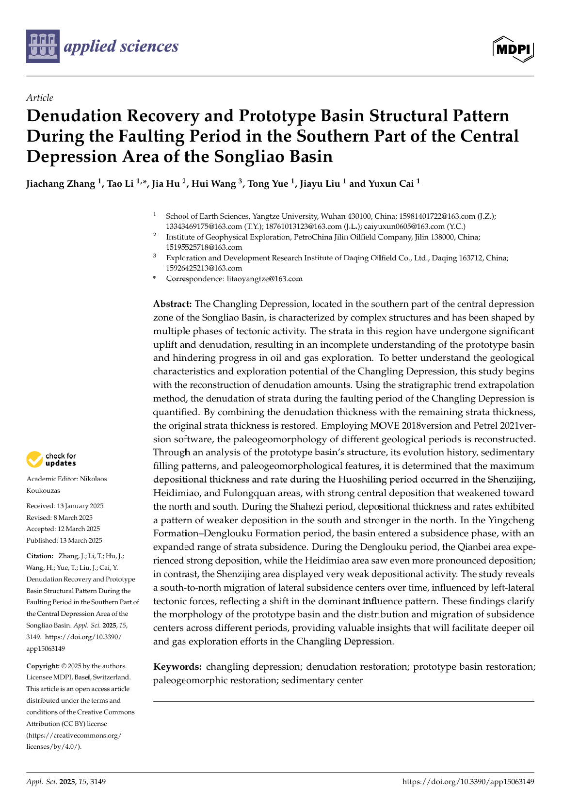 地科学院硕士研究生张珈畅在《applied sciences》上发表题目为“Denudation Recovery and Prototype Basin Structural Pattern During the Faulting Period in the Southern Part of the Central Depression Area of the Songliao Basin”的研究论文。澳门十大网投正规官网平台为论文第一署名单位。研究生张珈畅为第一作者,李涛副教授为论文通讯作者。该研究从剥蚀量恢复入手,采用地层趋势外推法计算了长岭断陷断陷期地层的剥蚀量,恢复了原始地层厚度,重建了不同时期的古地貌。研究结果表明:火石岭期最大沉积厚度和沉积速率发生在中部神字井洼槽,向南北方向减弱;在沙河子期,沉积厚度和速率呈现出南弱北强的格局;营城组-登娄库组时期,地层沉降幅度加大,登娄库期乾北、黑帝庙地区沉积强烈,神字井地区逐渐减弱,横向沉降中心体现出由南向北迁移的迁移特征,明确了其受左旋作用的影响,这项研究将剥蚀恢复和古地貌学相结合,从而准确重建了长岭断陷的原型盆地形态,通过分析不同时期的沉降中心及分布规律,提出了洼槽差异性演化概念,解决了研究的局限性,建立了完善的地质框架,提高了长岭断陷的油气勘探战略精确性。