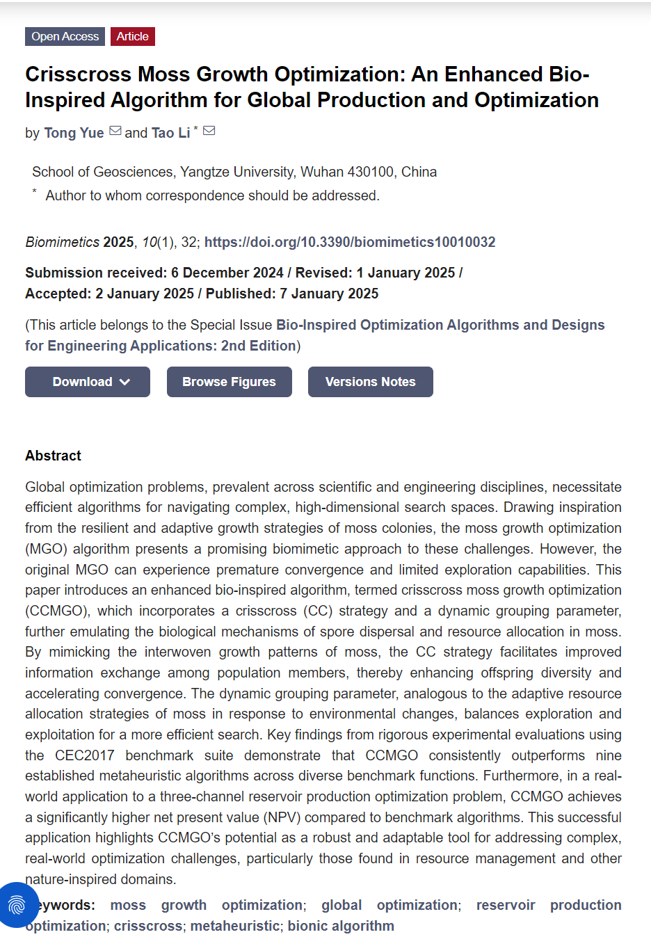 澳门十大网投正规官网平台硕士研究生岳彤在期刊《Biomimetics》上发表题为“Crisscross Moss Growth Optimization: An Enhanced Bio-Inspired Algorithm for Global Production and Optimization”的研究论文。澳门十大网投正规官网平台为论文第一署名单位,岳彤为论文第一作者。