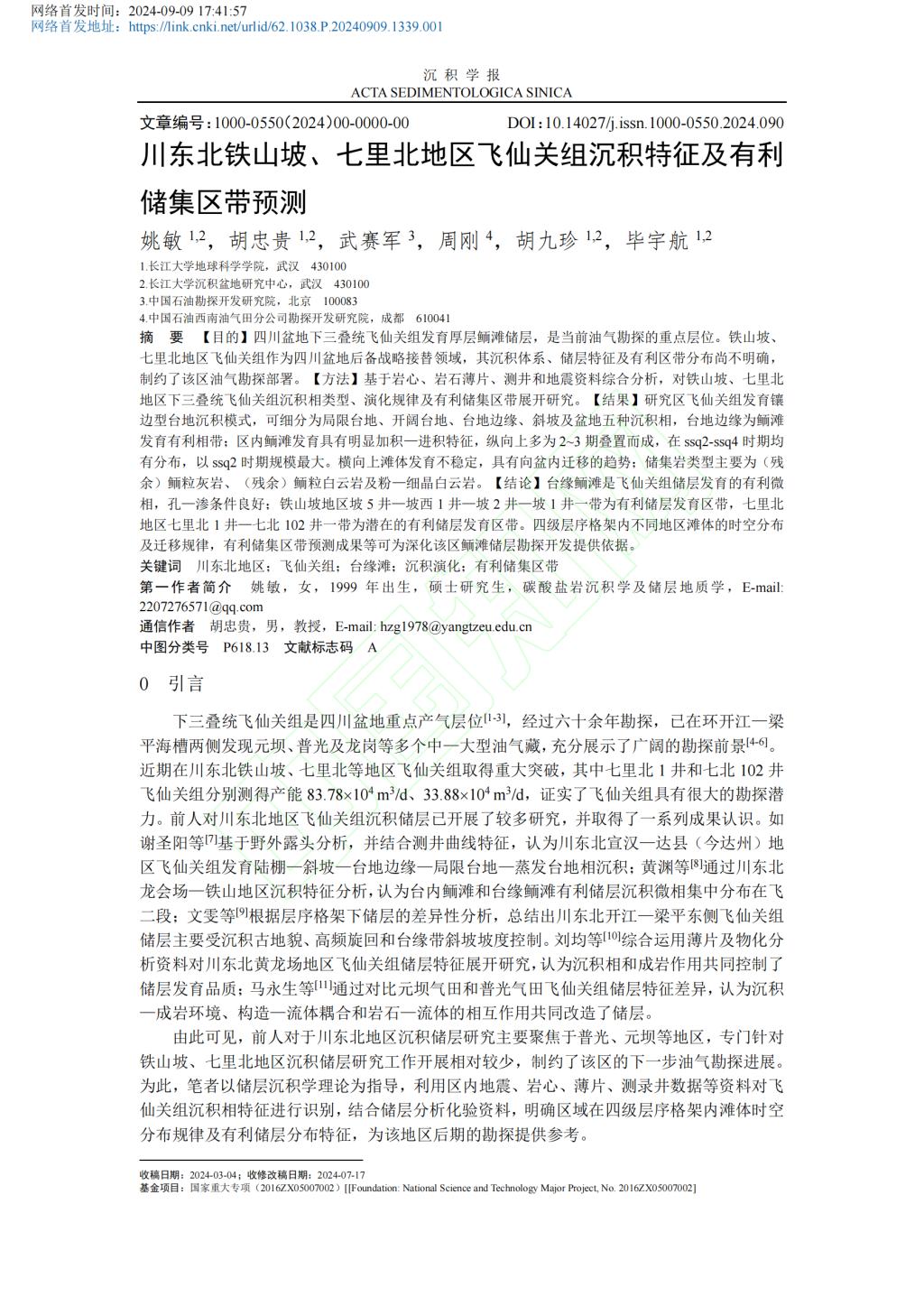 澳门十大网投正规官网平台22级硕士研究生姚敏在期刊《沉积学报》上发表题为“川东北铁山坡、七里北地区飞仙关组沉积特征及有利储集区带预测”的研究论文。澳门十大网投正规官网平台为论文第一署名单位,硕士研究生姚敏为论文第一作者,其导师胡忠贵教授为该文通讯作者。