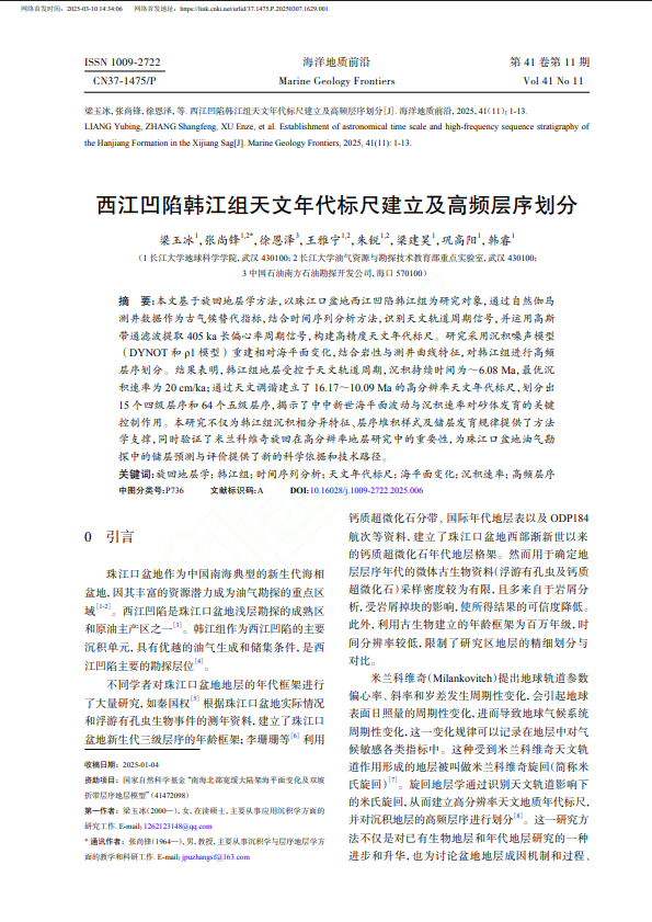 澳门十大网投正规官网平台硕士生梁玉冰在《海洋地质前沿》发表题为“西江凹陷韩江组天文年代标尺建立及高频层序划分”的研究论文。澳门十大网投正规官网平台为论文第一署名单位,通讯作者为张尚锋教授。