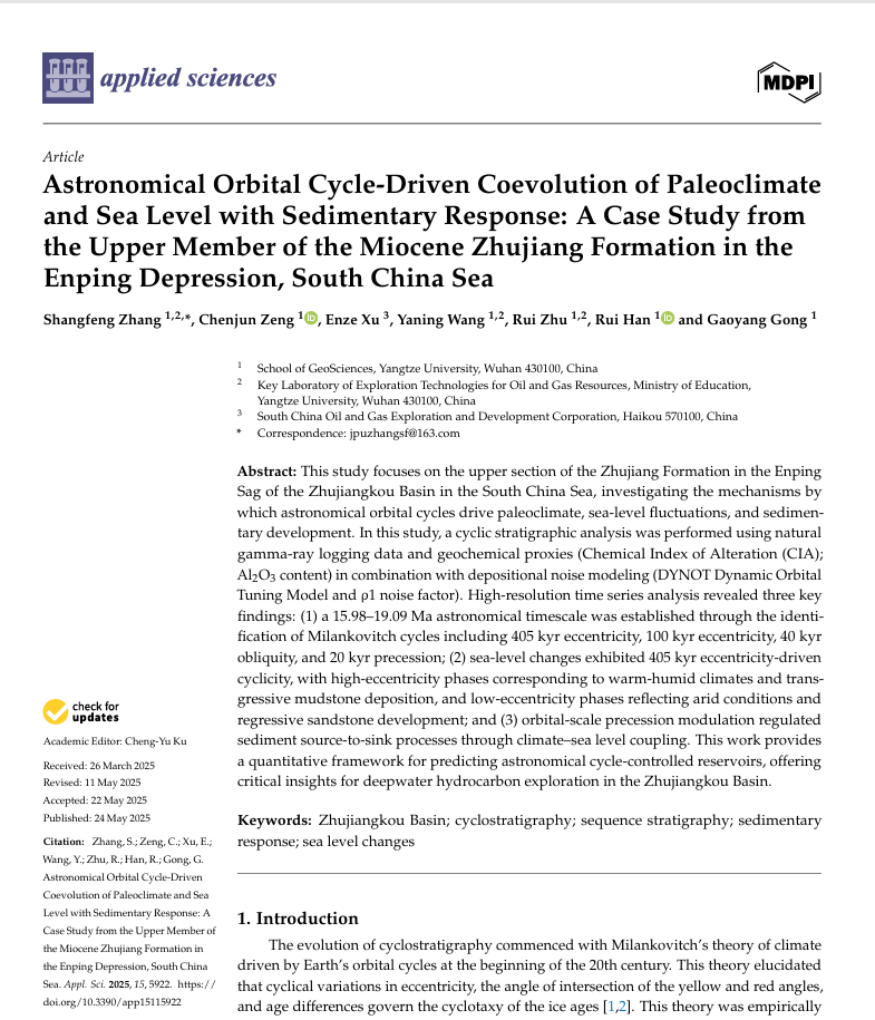 澳门十大网投正规官网平台张尚锋教授在《Applied sciences》上发表题为“Astronomical Orbital Cycle-Driven Coevolution of Paleoclimate and Sea Level with Sedimentary Response: A Case Study from the Upper Member of the Miocene Zhujiang Formation in the Enping Depression, South China Sea”的研究论文。澳门十大网投正规官网平台为论文第一署名单位,张尚锋教授为论文第一作者,硕士生曾晨峻为该文第二作者。该项研究得到国家自然科学基金“南海北部宽缓大陆架海平面变化及双坡折带层序地层模型”的资助。