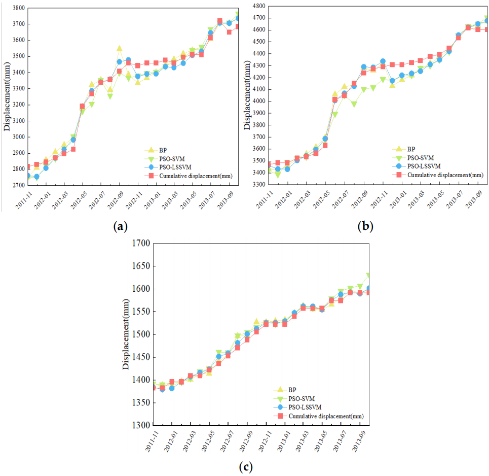 论文提出了以三峡库区叔坪滑坡为例,通过时间序列模型 (TSM)将位移分解为两个分量。选择基于降雨量和水库水位优化的最小二乘支持向量机(LSSVM)模型来预测基于降雨和库水位的滑坡位移预测。选择五个参数作为输入变量,包括单月降雨量、双月降雨量、库水位、上月库水位变化和半年周期位移。通过灰色相关分析揭示了5个参数与滑坡位移之间的关系。PSO-LSSVM模型用于预测周期项位移,应用最小二乘法预测趋势项位移。在相同的输入变量下,还建立了反向传播(BP)模型和 PSO-SVM 模型进行比较分析。PSO-LSSVM模型在3个模型中的的R2最大,为0.98,MAE值和RMSE值最小。结果表明,PSO-LSSVM模型在预测滑坡位移方面具有很高的准确性。