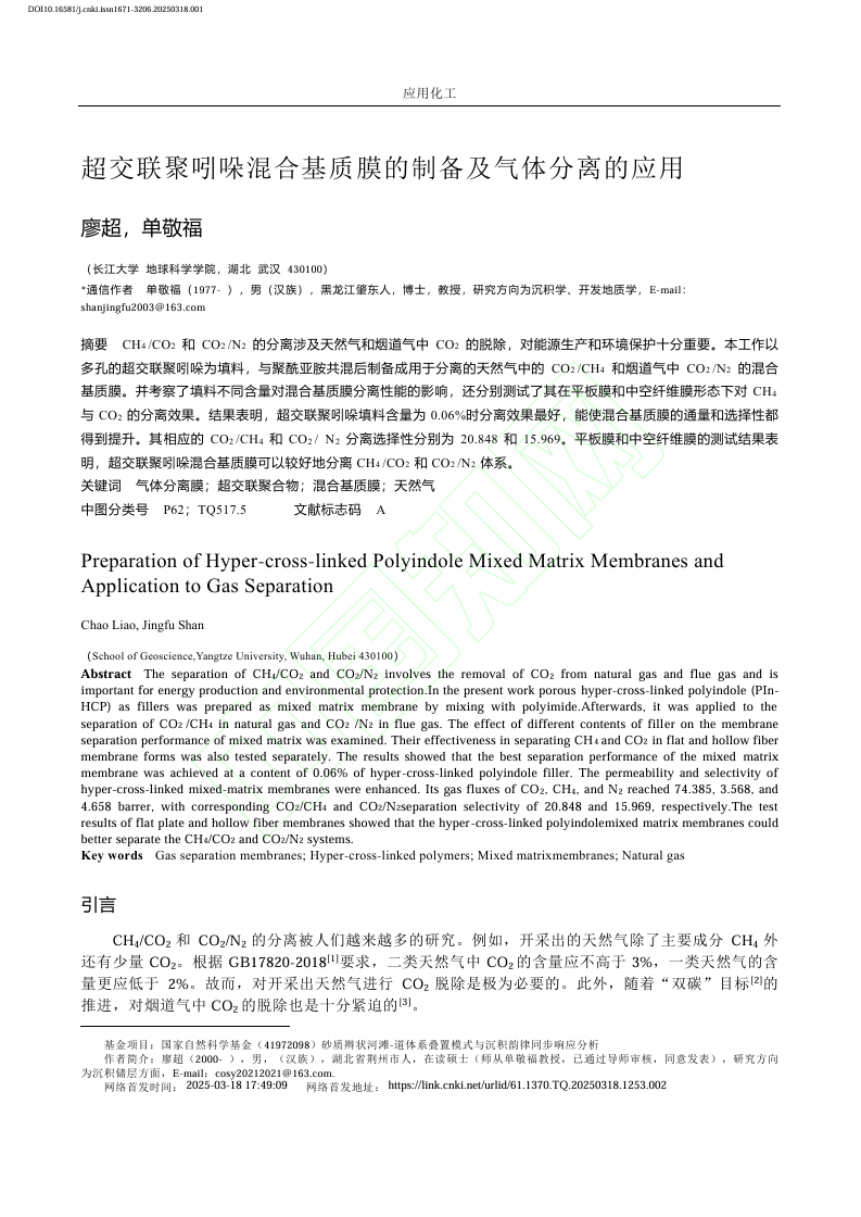 近日,澳门十大网投正规官网平台硕士生廖超在中文核心期刊《应用化工》上发表题为“超交联聚吲哚混合基质膜的制备及气体分离的应用”的研究论文。该论文以多孔的超交联聚吲哚为填料,与聚酰亚胺共混后制备成用于分离的天然气中的CO2/CH4和烟道气中CO2/N2的混合基质膜。澳门十大网投正规官网平台为论文第一署名单位,硕士生廖超为论文第一作者。