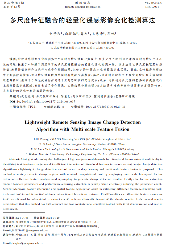 近日,澳门十大网投正规官网平台地图制图学与地理信息工程专业2022级硕士生刘子阳在中文核心期刊《遥感信息》发表题为“多尺度特征融合的轻量化遥感影像变化检测算法”的研究论文。澳门十大网投正规官网平台为论文第一署名单位,硕士生刘子阳为论文第一作者,其导师邓帆为通讯作者。