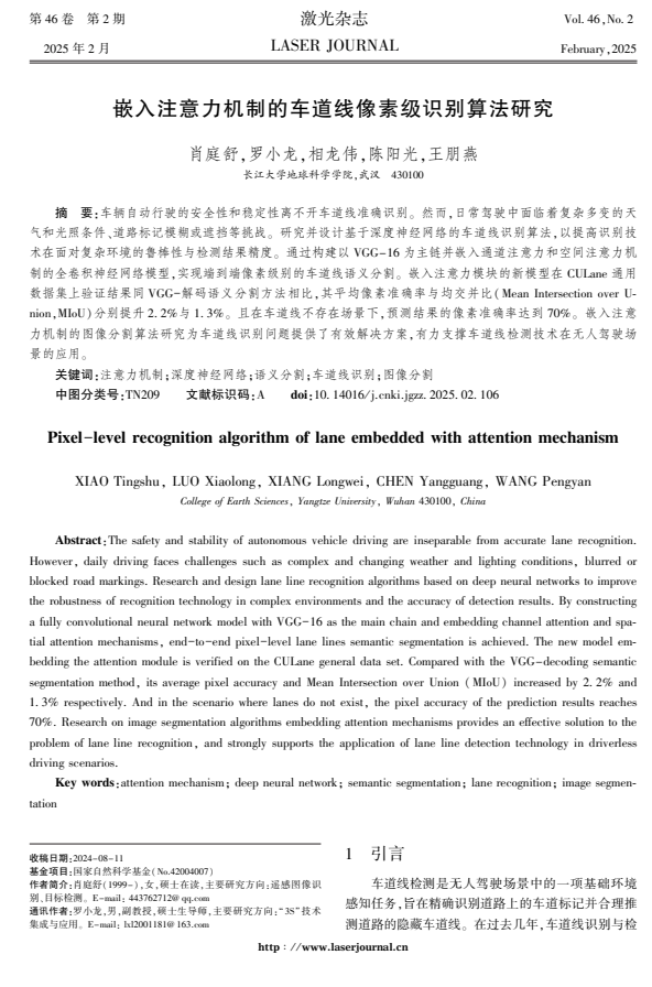 地科学院罗小龙副教授团队成员肖庭舒在期刊《激光杂志》上发表题为“嵌入注意力机制的车道线像素级识别算法研究”的研究论文。澳门十大网投正规官网平台为论文第一署名单位,硕士研究生肖庭舒为论文第一作者,其导师罗小龙副教授为该文通讯作者。