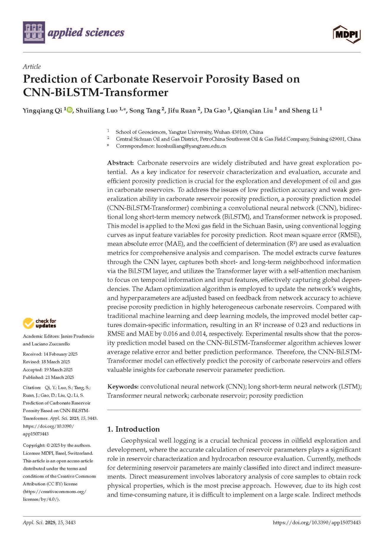 澳门十大网投正规官网平台硕士生漆影强在SCI收录期刊《Applied Sciences》上发表题为“Prediction of Carbonate Reservoir Porosity Based on CNN-BiLSTM-Transformer”的研究论文。澳门十大网投正规官网平台为论文第一署名单位,罗水亮副教授为第一通讯作者,论文由中国青年基金国家自然科学基金项目资助。