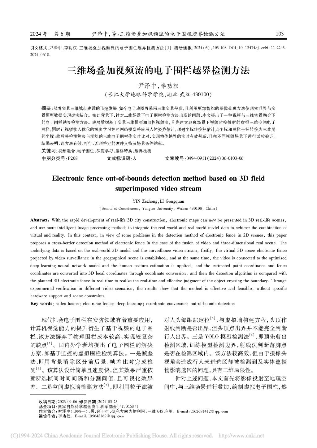 澳门十大网投正规官网平台李功权课题组硕士生尹泽中在《测绘通报》上发表题为“三维场叠加视频流的电子围栏越界检测方法”的研究论文。