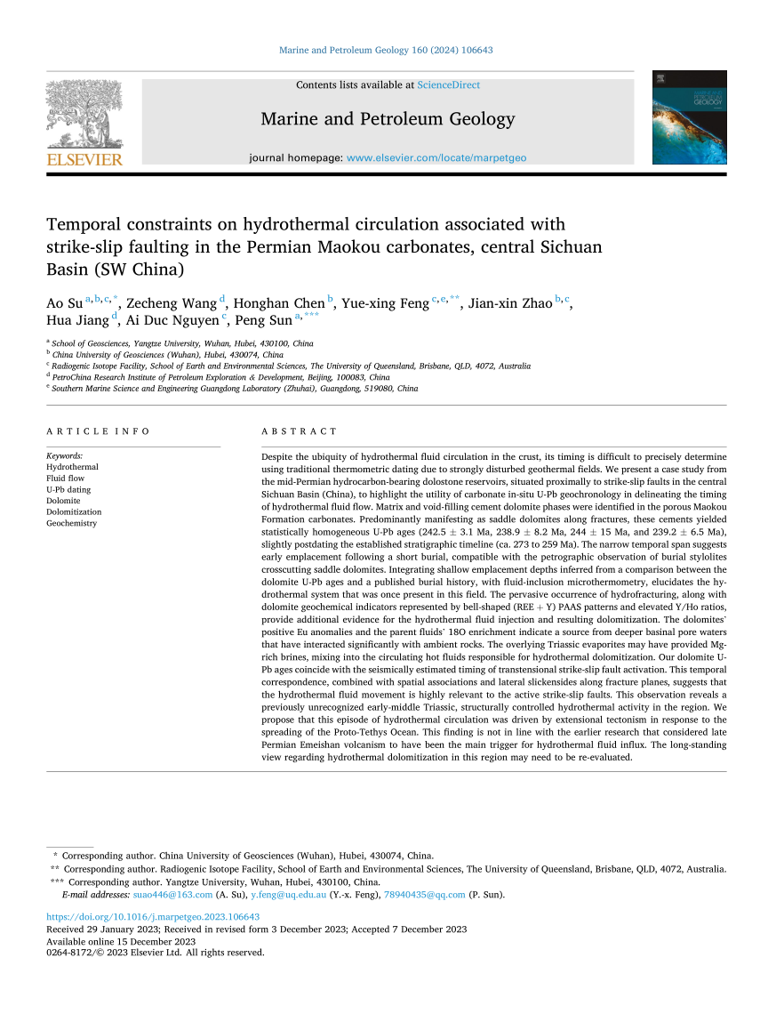 地科学院苏奥副教授在《Marine and Petroleum Geology》上发表题为“Temporal constraints on hydrothermal circulation associated with strike-slip faulting in the Permian Maokou carbonates, central Sichuan Basin (SW China)”的研究论文。澳门十大网投正规官网平台为论文第一署名单位。该论文深入探讨了构造活动作用下控制的热液活动模式,对该地区油气优势储层勘探具有一些参考意义。