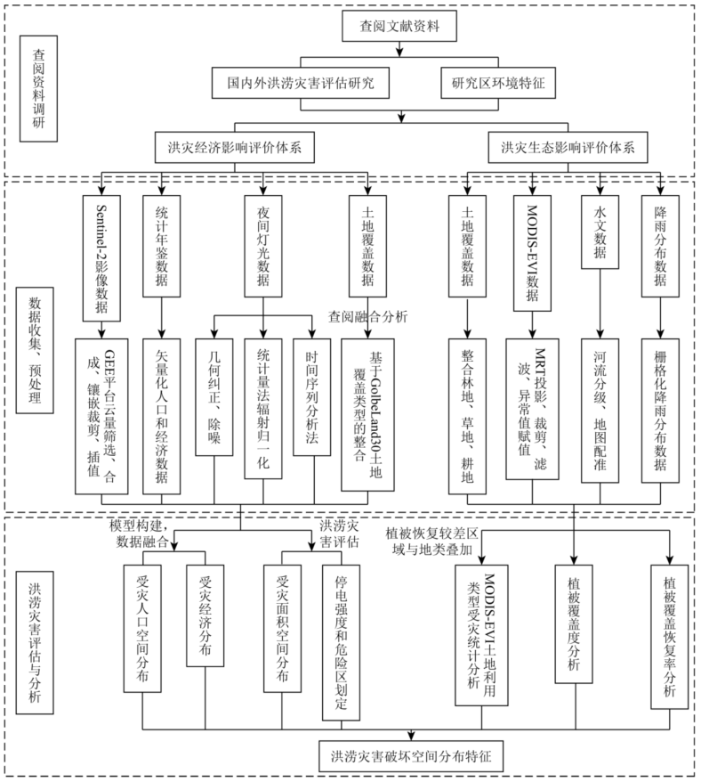 洪涝灾害发生后通过植被指数和灯光指数定量评估灾后恢复情况,对灾区经济建设和生态恢复的评估具有重要科学意义。该文以河南“7·20”暴雨灾害区为研究区,基于日度和月度NPP-VIIRS数据、Sentinel-NDVI、MODIS-EVI数据和统计年鉴数据,构建归一化差异城市指数(normalized difference urban index,NDUI)来表征城市内部空间细节;基于回归模型模拟人口和国内生产总值的空间分布;从研究区的夜间灯光数据和植被覆盖数据2个不同的维度来评估洪涝灾害。结果表明:高危区和中危区总面积为1 429.04 km2,占研究区总面积的6.06%,高危地区主要分布在郑州西部、新乡东部、安阳东部、鹤壁北部,其中郑州市受灾严重程度最高;从植被覆盖度恢复率(vegetation cover recovery rate, VCRR)来看,卫辉市、淇县、滑县、林州市等地区整体植被恢复情况较差,其VCRR的值大部分在0以下,植被覆盖有恶化趋势。NDUI与社会经济统计数据拟合精度高于0.8,表明NDUI可以在洪涝灾害发生后应用于精确位置救援和灾后针对性重建工作;NPP-VIIRS和MODIS-EVI评估洪涝灾害的结果具有很好的互补性,2种数据的有机结合进行洪涝灾害研究,对灾后救援和恢复评估均有较高的应用价值。