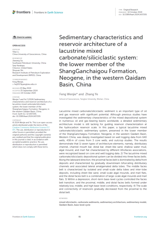 澳门十大网投正规官网平台教师冯文杰在《Frontiers in Earth Science》上发表题为“Sedimentary characteristics and reservoir architecture of a lacustrine mixed carbonate/siliciclastic system: the lower member of the ShangGanchaigou Formation, Neogene, in the western Qaidam Basin, China”的研究论文。该论文针对柴达木盆地西部地区新近系上干柴沟组下段混积体系开展野外露头无人机倾斜摄影建模与解剖、地下储层表征,明确了油田开发尺度下,混积体系沉积特征与沉积模式。