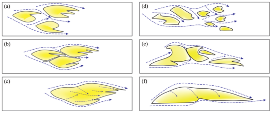 研究表明:①辫状河心滩受两侧水流的影响,其沉积演化是先向下迁移后侧向迁移;而河边滩受单侧水流的影响,沉积演化是先侧向迁移后向下迁移。②河心滩自下而上发育顺流加积体、侧积体和垂向加积体,河边滩自下而上由侧积体、垂向加积体或向心充填的河道沉积构成。③河边滩比河心滩内部的侧积体期次多,叠切关系复杂。