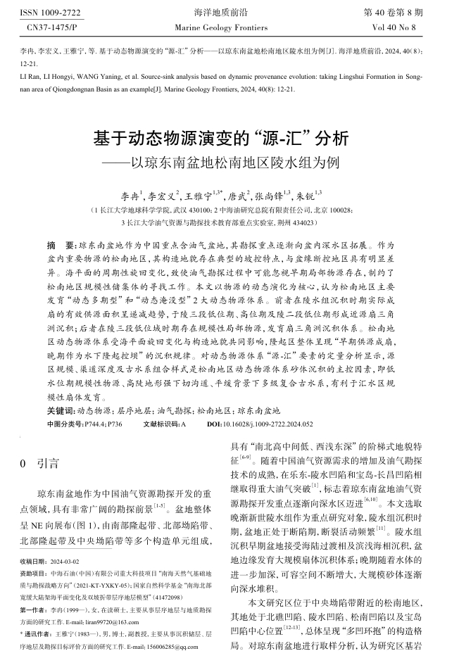 地科学院硕士生李冉在《海洋地质前沿》发表题为“基于动态物源演变的“源-汇”分析—以琼东南盆地松南地区陵水组为例”的研究论文。澳门十大网投正规官网平台为论文第一署名单位,通讯作者为王雅宁副教授。