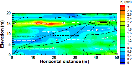 研究表明,基础的分层结构变化对水库水位波动的地下水响应有显著影响。特别是,基础中压力水头(p)及其标准差(σp)的不确定性在水库侧的初始水位附近和远离水库的区域最为显著。此外,研究发现基础中的饱和水力传导系数(Ks)变化对压力头分布有重要影响。具体来说,较大的Ks值出现在水库侧的最高水位附近,而较小的Ks值则位于水库侧的初始水位附近,这种结构差异可能会导致基础中的压力水头(p)值较大。