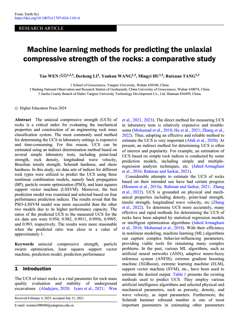 地科学院温韬教授以第一作者身份在《Frontiers of Earth Science》上发表题为“Machine learning methods for predicting the uniaxial compressive strength of the rocks: a comparative study”的研究论文。澳门十大网投正规官网平台为论文第一署名单位。