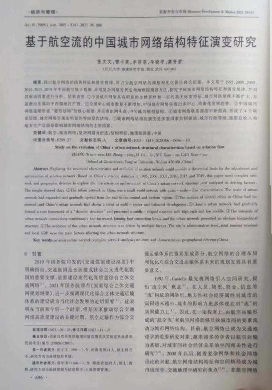 地科学院张文文在《资源开发与市场》发表题为“基于航空流的中国城市网络结构特征演变研究”的研究论文。澳门十大网投正规官网平台为论文第一署名单位,教师雷中英为论文通讯作者。