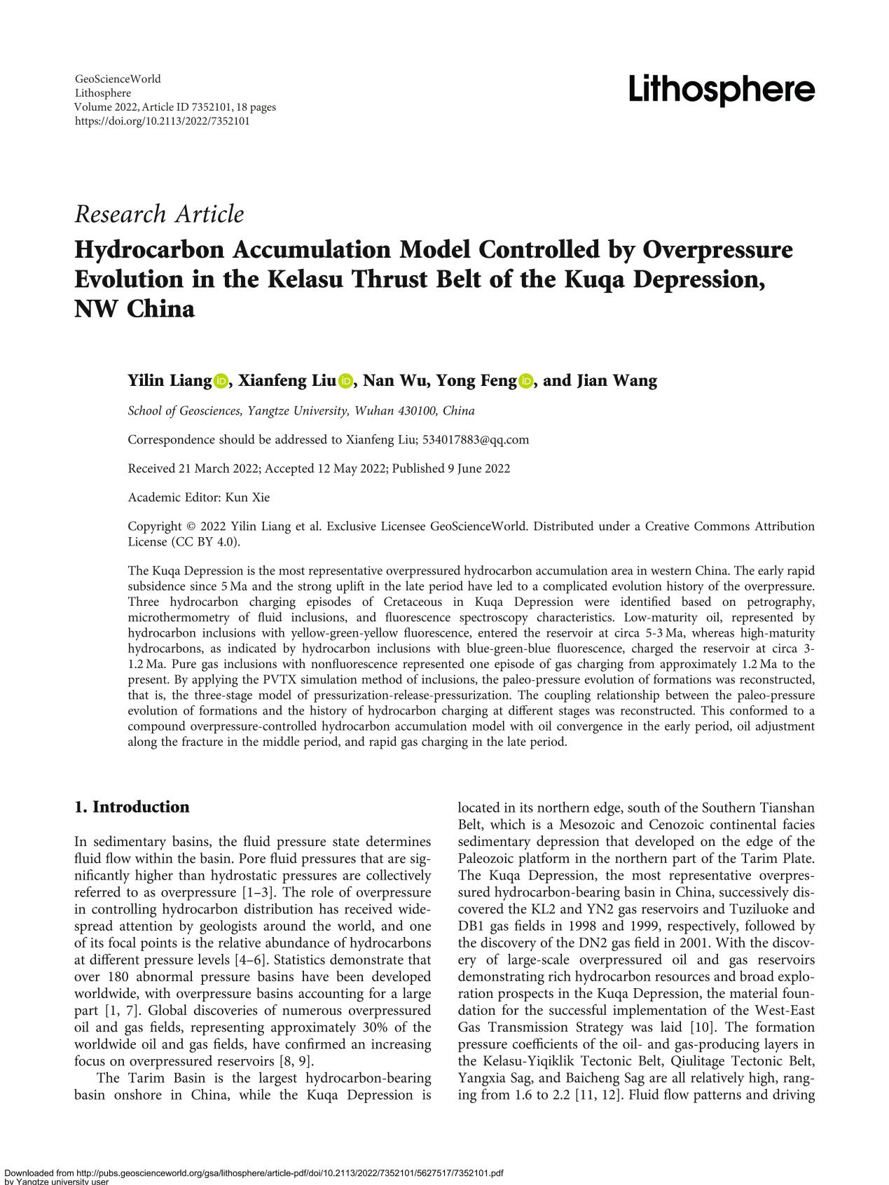 地科学院博士生梁祎琳在《LITHOSPHERE》上发表题为“Hydrocarbon Accumulation Model Controlled by Overpressure Evolution in the Kelasu Thrust Belt of the Kuqa Depression, NW China”的研究论文。澳门十大网投正规官网平台为论文第一署名单位,博士生梁祎琳为论文第一作者,教师刘显凤为通讯作者。