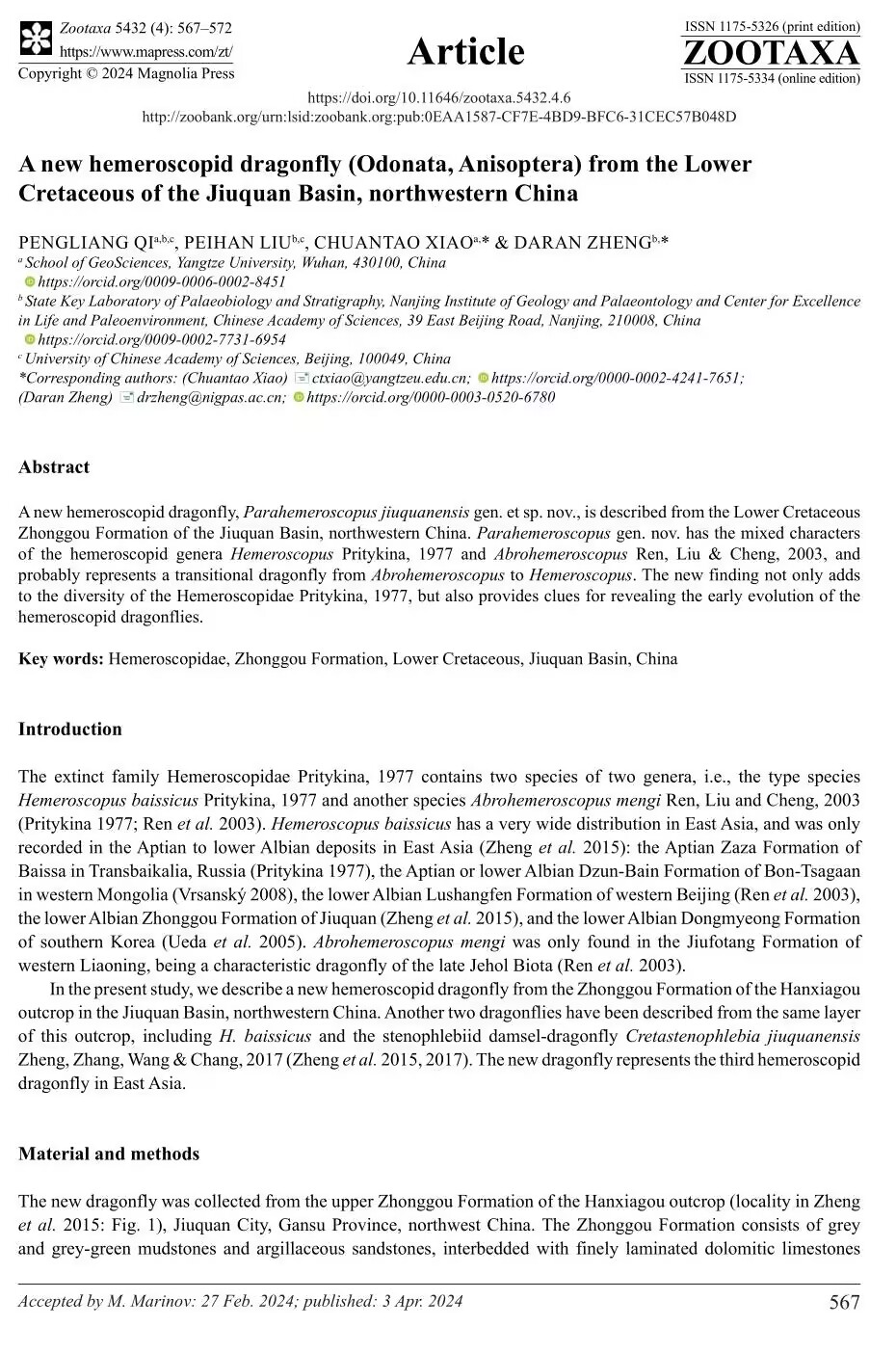 澳门十大网投正规官网平台地质资源与地质工程专业硕士生漆鹏亮在在古生物学期刊《ZOOTAXA》上发表题为“A new hemeroscopid dragonfly (Odonata, Anisoptera) from the Lower Cretaceous of the Jiuquan Basin, northwestern China”的研究论文。澳门十大网投正规官网平台为论文第一署名单位,漆鹏亮为第一作者,其导师肖传桃教授为第一通讯作者。