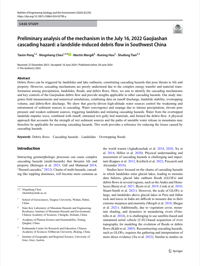 地科学院陈宁生教授团队在《Bulletin of Engineering Geology and the Environment》发表了题为“Preliminary analysis of the mechanism in the July 16, 2022 Gaojiashan cascading hazard: a landslide-induced debris flow in Southwest China”的研究论文。陈宁生教授为通讯作者,澳门十大网投正规官网平台为第一署名单位。本研究获得国家自然科学基金重点研发项目的资助。