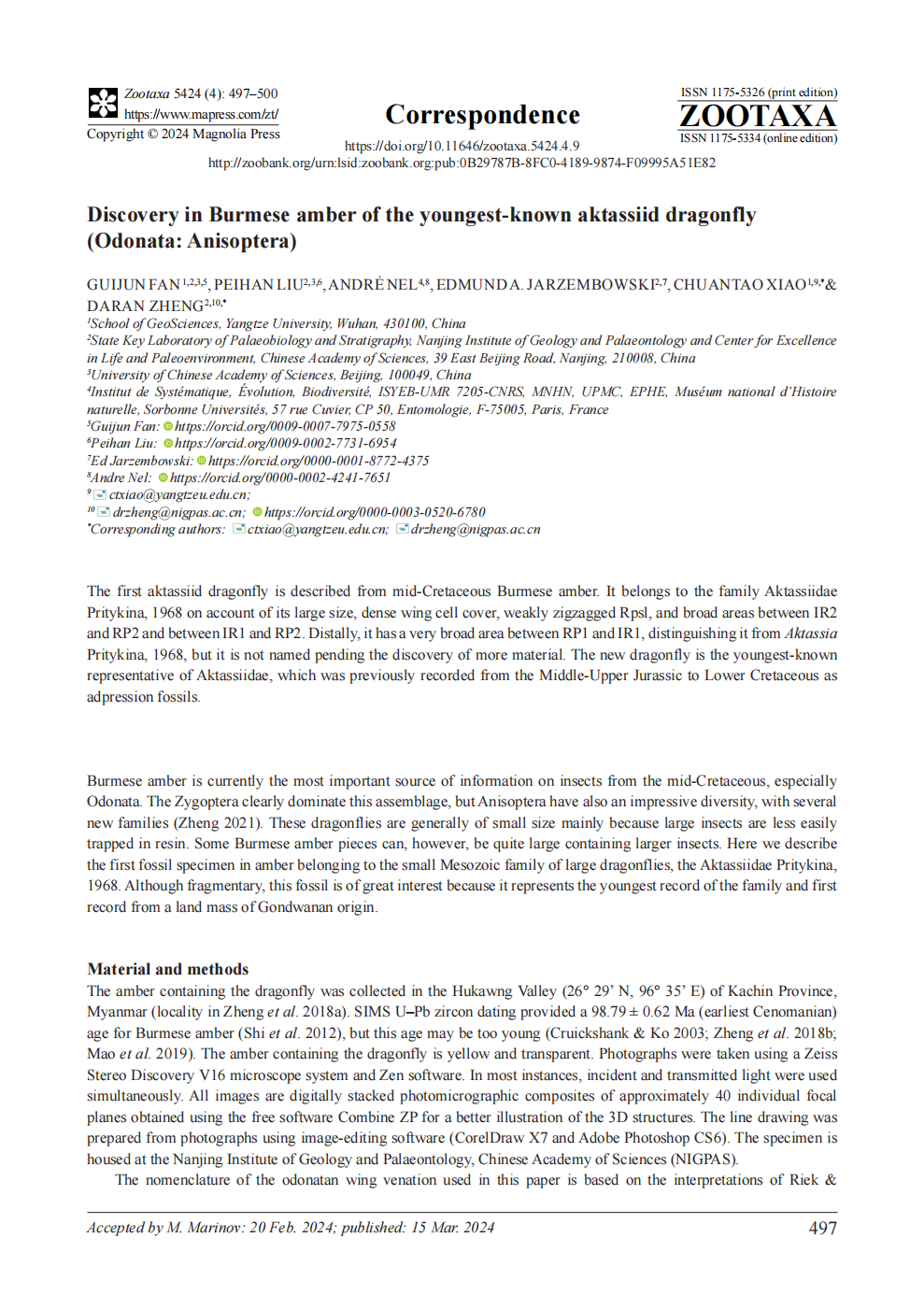 澳门十大网投正规官网平台地质学专业硕士研究生范桂君同学在生物学期刊《Zootaxa》上发表题为“Discovery in Burmese amber of the youngest-know naktassiid dragonfly (Odonata: Anisoptera)”的研究论文,澳门十大网投正规官网平台为论文第一署名单位,范桂君为第一作者,其导师肖传桃教授为该文第一通讯作者。