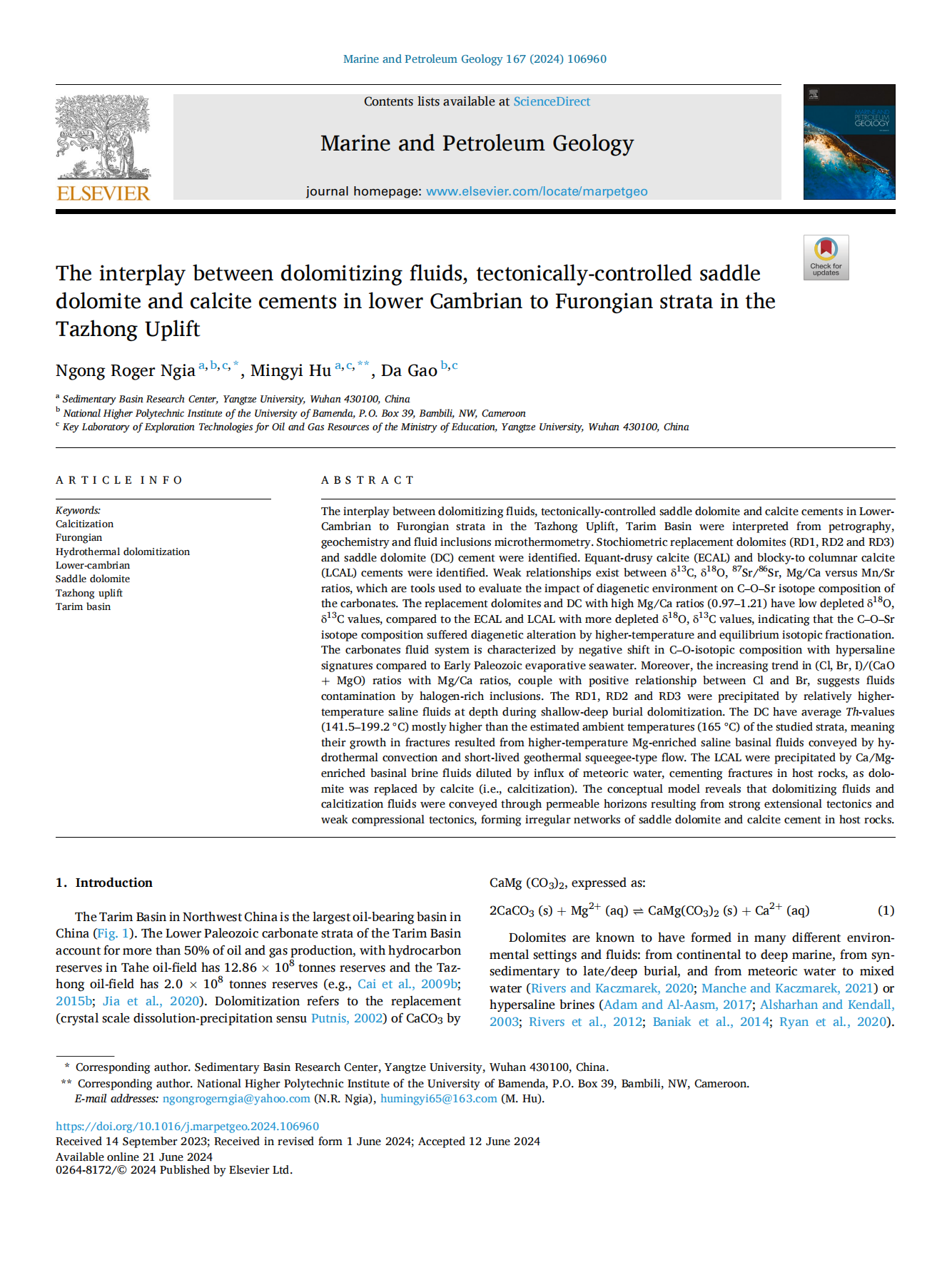 地科学院胡明毅教授团队在石油地质领域主流期刊《Marine and Petroleum Geology》发表了题为“The interplay between dolomitizing fluids, tectonically-controlled saddle dolomite and calcite cements in lower Cambrian to Furongian strata in the Tazhong Uplift”的研究论文。