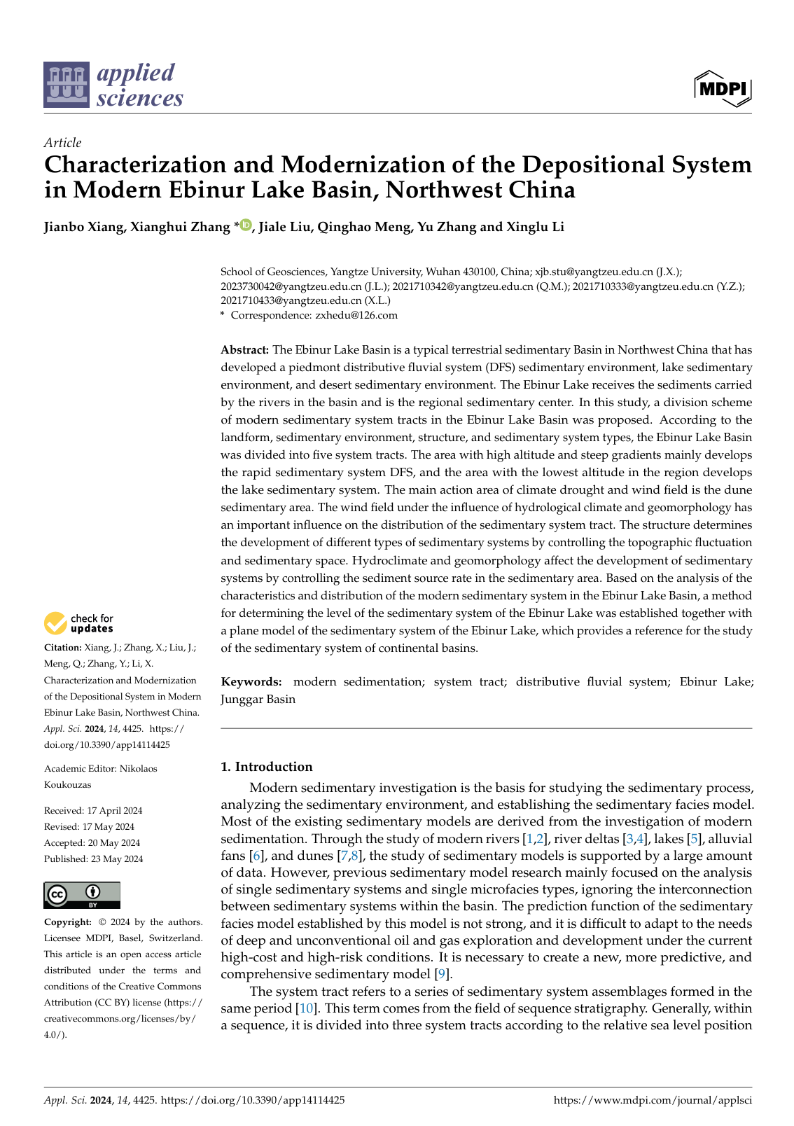 澳门十大网投正规官网平台硕士生向建波在期刊《applied sciences》上发表题为“Characterization and Modernization of the Depositional System in Modern Ebinur Lake Basin, Northwest China”的研究论文。澳门十大网投正规官网平台为论文第一署名单位,张祥辉博士为第一通讯作者,本项研究得到国家自然科学基金重点项目、湖北省自然科学基金项目共同资助。