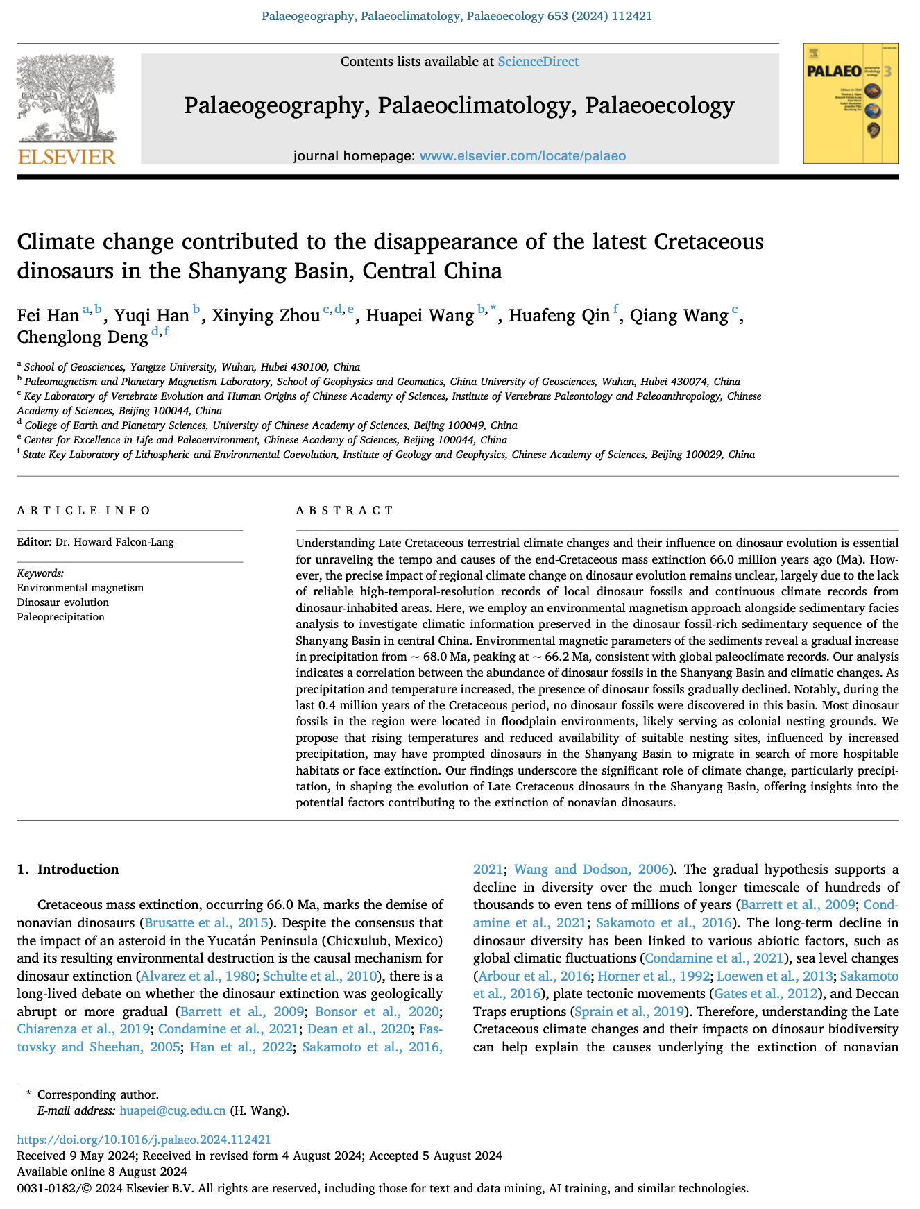 论文信息:Han, F., Han, Y., Zhou, X., Wang, H., Qin, H., Wang, Q., & Deng, C. (2024). Climate change contributed to the disappearance of the latest Cretaceous dinosaurs in the Shanyang Basin, Central China. Palaeogeography, Palaeoclimatology, Palaeoecology, 653, 112421.https://doi.org/10.1016/j.palaeo.2024.112421