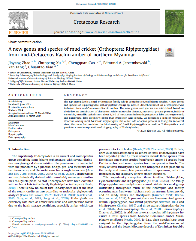澳门十大网投正规官网平台地质学专业硕士研究生赵金阳同学在在地学综合研究领域期刊《Cretaceous Research》上发表题为“A new genus and species of mud cricket (Orthoptera: Ripipterygidae) from mid-Cretaceous Kachin amber of northern Myanmar”的研究论文(图1)。澳门十大网投正规官网平台为论文第一署名单位,赵金阳为第一作者,其导师肖传桃教授为该文第一通讯作者。