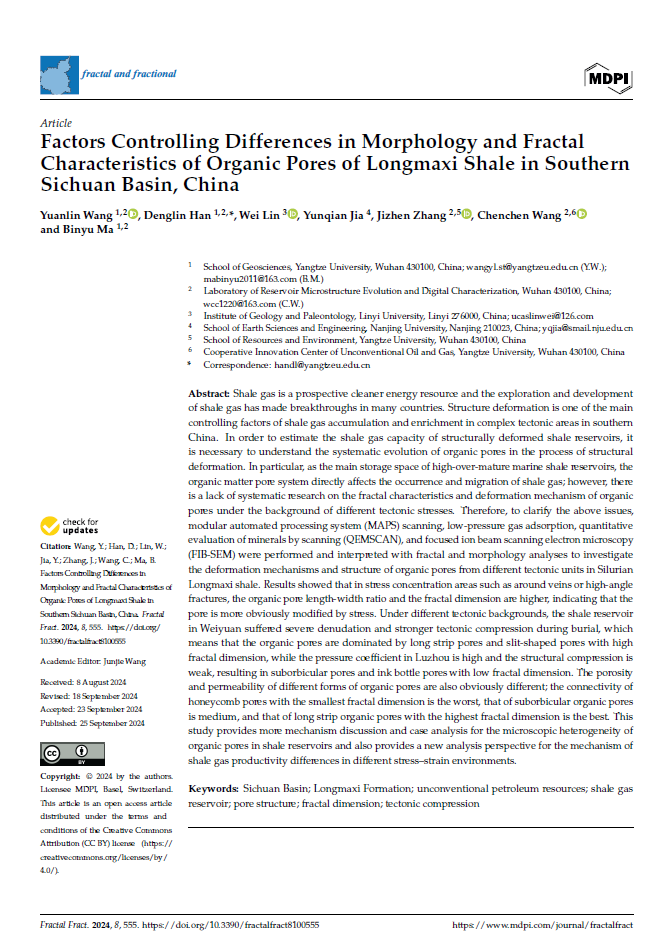澳门十大网投正规官网平台地质资源与地质工程专业硕士研究生王园林在韩登林教授的指导下,以第一作者的身份在《fractal and fractional》上发表题为“Factors Controlling Differences in Morphology and Fractal Characteristics of Organic Pores of Longmaxi Shale in Southern Sichuan Basin, China”的研究论文。