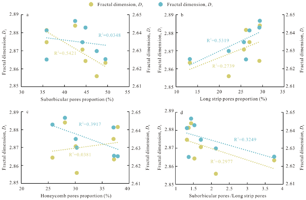 图2 不同形貌特征孔隙占比与分形维数相关性