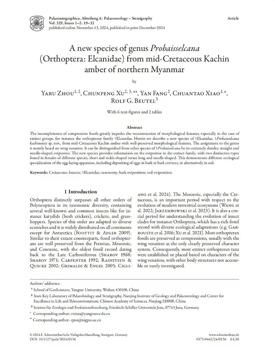 澳门十大网投正规官网平台地质学专业硕士研究生周雅茹在肖传桃教授、南京地质古生物研究所的许春鹏博士的共同指导下,在地球科学与古生物学领域期刊《PalaeontographicaAbteilungA》上发表题为“Anew species of genusProbaisselcana (Orthoptera:Elcanidae) from mid-Cretaceous Kachin amber of northern Myanmar”的研究论文。