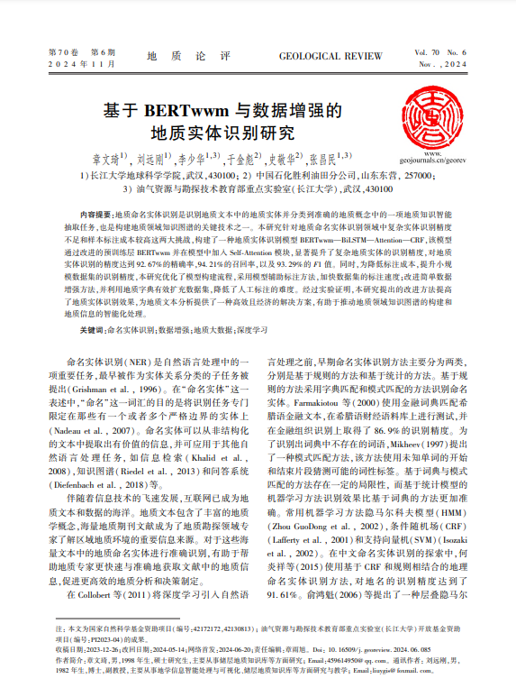 地科学院刘远刚团队硕士研究生章文琦在《地质论评》发表了题为《基于BERTwwm与数据增强的地质实体识别研究》的研究论文,澳门十大网投正规官网平台为论文第一署名单位,章文琦为论文第一作者,其导师刘远刚为该文通讯作者。