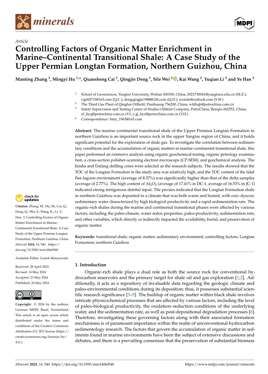 澳门十大网投正规官网平台地质系胡明毅教授团队长期从事储层沉积学及页岩气资源评价等方向的研究。团队成员张曼婷博士在期刊《Minerals》上发表题为《Controlling Factors of Organic Matter Enrichment in Marine–Continental Transitional Shale: A Case Study of the Upper Permian Longtan Formation, Northern Guizhou, China》的研究论文,澳门十大网投正规官网平台为论文第一署名单位,博士生张曼婷为论文第一作者,其导师胡明毅教授为该文通讯作者。