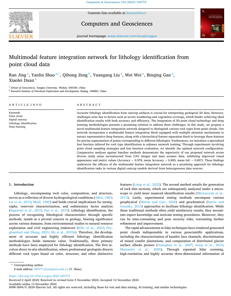 十大网投正规官网教师井然博士在国际学术期刊《Computers & Geosciences》上发表了题为“Multimodal feature integration network for lithology identification from point cloud data“的SCI论文,提出了一种基于多模态特征融合的三维露头点云岩性识别方法。该研究不仅在方法上具有创新性,而且在实际应用中有较好的性能表现,为地质露头点云的岩性判别提供了新的技术路径。