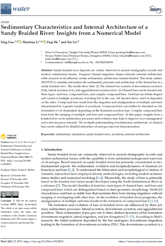澳门十大网投正规官网平台郭颖博士在期刊《Water》上发表题为“Sedimentary Characteristics and Internal Architecture of a Sandy Braided River: Insights from a Numerical Model”的研究论文。澳门十大网投正规官网平台为论文第一署名单位,郭颖博士为第一作者,其导师李少华教授为该文通讯作者。