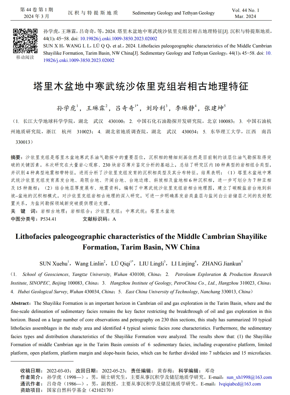 十大网投正规官网硕士生孙学虎在《沉积与特提斯地质》上发表了题为“塔里木盆地中寒武统沙依里克组岩相古地理特征”的研究论文,采用岩相学、沉积学的方法,分析了塔塔里木盆地沙依里克组岩相古地理过程。澳门十大网投正规官网平台为论文第一署名单位,孙学虎为第一作者,导师吕奇奇副教授为通讯作者。