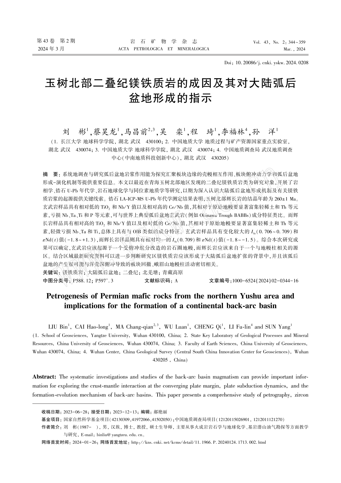 澳门十大网投正规官网平台刘彬教授团队在《岩石矿物学杂志》期刊上发表题为“玉树北部二叠纪镁铁质岩的成因及其对大陆弧后盆地形成的指示”的研究论文。刘彬教授为第一作者和通讯作者,该项研究得到了国家自然科学基金等项目资助。