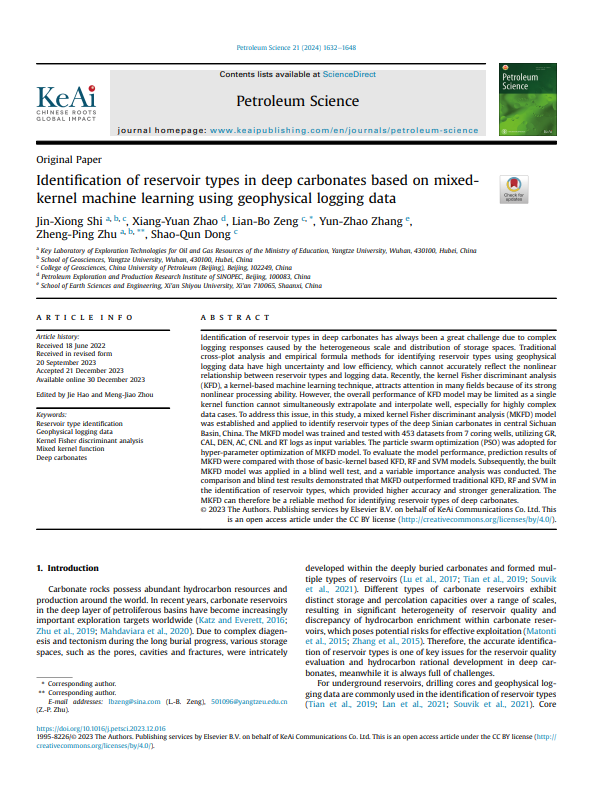 澳门十大网投正规官网平台石油系教师史今雄博士在石油领域重要期刊《Petroleum Science》上发表题为“Identification of reservoir types in deep carbonates based on mixed-kernel machine learning using geophysical logging data”的研究论文。本项研究得到了国家自然科学基金项目和湖北省自然科学基金项目的资助。